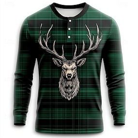 Herren Weihnachten Karomuster Rentier Henley Hemd Langarm Mode Niedlich Täglich Lässig Ferien Ausgehen Herbst Frühling & Herbst Grün Henley Henley T-Shirt