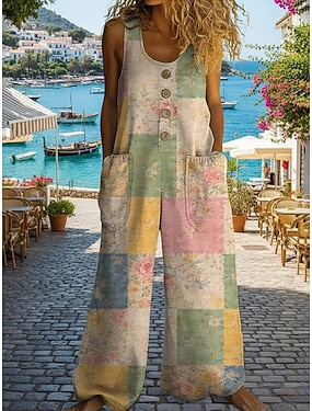 Damen Overall Aktiv Blumen Ärmellos Ärmellos Weites Bein U-Ausschnitt Tasche Knöpfe Täglich Urlaub Lässiger Schnitt Grün Sommer