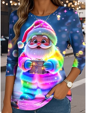 Weihnachten Damen T Shirt Druck Grafik Weihnachtsmann Vintage Mode Stilvoll Langarm Rundhalsausschnitt Rundhals Normale Oberteile Täglich Wochenende Blau Rote Purpur Fuchsie Grün Sommer Frühling