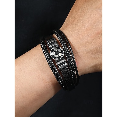 Fußballarmband für Herren – geflochtenes Wickelarmband aus schwarzem Kunstleder mit Fußballanhänger, sportlich inspirierter Schmuck für die Freizeit und als Geschenk