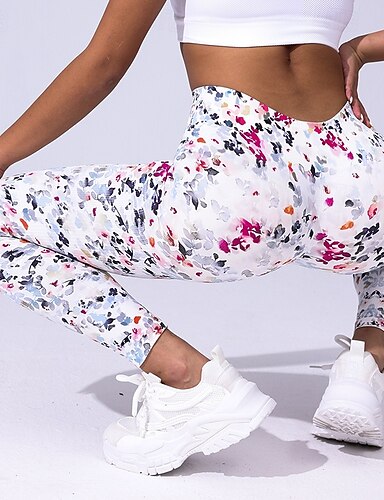 Damen Kompressionshose Enge Laufhosen Yoga-Leggings Bauchkontrolle Hohe Taille Fitnessstudio Training sportlich Unterteile Blumendruck Weiß Herbst Sport Sportkleidung