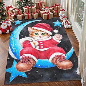 Weihnachtsmond Katzenbereich Teppich für Wohnzimmer und Schlafzimmer Faux Kaschmir Niedliche Katze im Weihnachtsmann auf dem Mond Teppich Festliche Feiertagskunst Teppich Weich Rutschfest