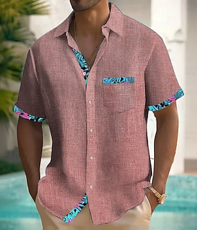 Herren Tropische Pflanzen Leinenhemd Sommer Hawaiihemd Knopfhemd Kurzarm Hawaiianisch Resort Urlaub Ferien Strandbekleidung Sommer Frühling Umlegekragen Hemden mit Kragen Eine Tasche vorne Rosa