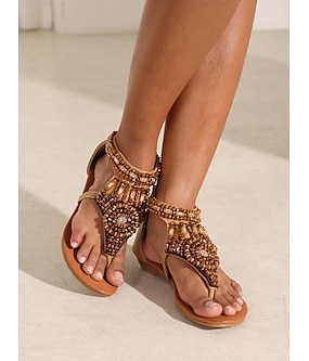 Damen-T-Riemchensandalen im Boho-Stil mit Perlen und Strass-Akzenten – stylische und bequeme flache Schuhe für Sommer, Strand und Freizeit