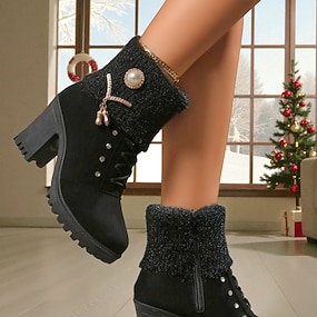 Schwarze Winterstiefel für Damen mit Kunstfellfutter – Samt-Schneestiefel mit dickem Absatz und goldenem Akzent für kaltes Wetter, Skiausflüge und Urlaubsoutfits