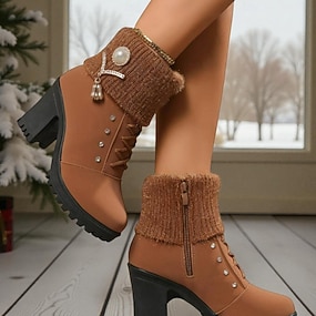 Braune Damenstiefeletten aus Kunstleder mit Fellbündchen und klobigem Blockabsatz – warme Winter-Schnürstiefeletten mit Strass-Detail für Damen, perfekt für Outdoor, Freizeit und Urlaub