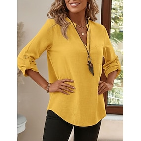 Damen Baumwoll-Leinen-Hemden Sommeroberteile Bluse Elegante Oberteile Gerafft Patchwork Tasche Einfarbig Einfach Elegant Vintage Damen Dreiviertelarm Hemdkragen Normale Oberteile Täglich Arbeit
