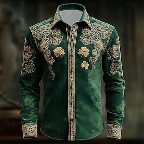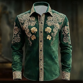 St. Patrick's Day Herren Vierblättriger Kleeblatt Shamrock Keltische Kunst Hemd Button Up Hemd Langarm Vintage Retro Feiertag Frühling Herbst Umgeschlagen 3D Druck Leinenähnliches Hemd Grün 1