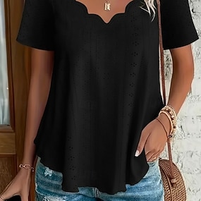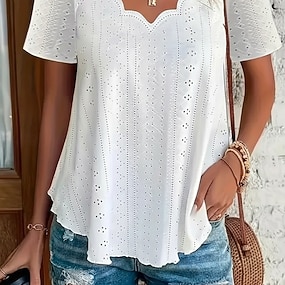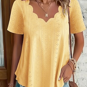 Damen Oberteil mit Ösen Pointelle Tee T Shirt T-Shirt Strukturiert Elegant Stilvoll Klassisch Kurzarm V Ausschnitt Normale Oberteile Lässig Strand Weiß Gelb Rosa Sommer
