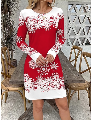 Weihnachten Damen Schneeflocken Mini Kleid Schokoladenkleid Bodycon Kleid Party Lässig Boho Schule Urlaub Grafik Langarm Rundhals Rot Blau Braun Grün Frühling Herbst Winter