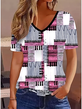 Damen T Shirt Grafik Geometrisch Karomuster Bohemien Vintage Stilvoll Kurzarm V Ausschnitt Normale Oberteile Täglich Ausgehen Wochenende Druck Rosa Sommer Frühling Herbst