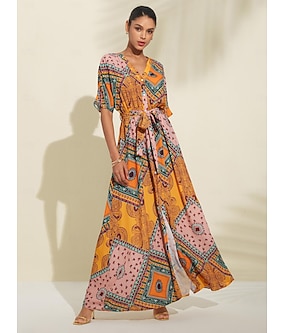Maxikleid mit Folk-Print und V-Ausschnitt