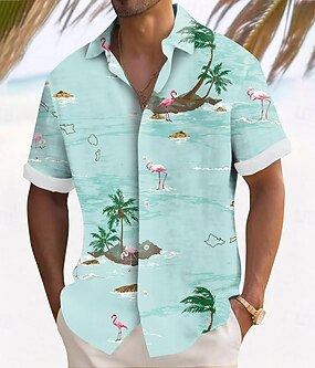 Herren Flamingo Kokospalme Tropische Pflanzen Hemd Sommer Hawaiihemd Knopfhemd Kurzarm Hawaiianisch Resort Urlaub Ferien Strandbekleidung Sommer Frühling Umlegekragen 3D-Druck Hemden mit Kragen Blau