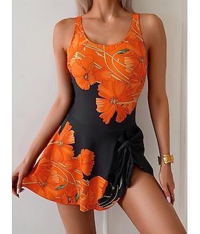 Damen Einteiler Badeanzug mit Rock Urlaub Strandbekleidung Blumen Grafik U-Ausschnitt Ärmellose Badeanzüge