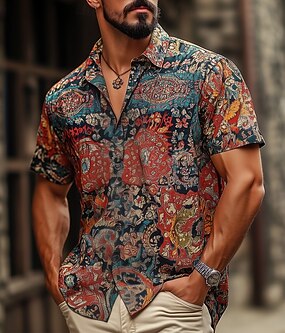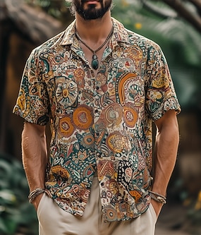 Herren Blumendruck Indianer Boho Hemd Sommer Hawaiihemd Knopfhemd Kurzarm Hawaiianisch Urlaub Ferien Strandbekleidung Sommer Frühling Umlegekragen 3D-Druck Hemden mit Kragen Orange Khaki