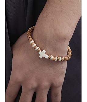 Herrenarmband aus Naturholzperlen mit türkisfarbenem Kreuz – handgefertigtes Boho-Stretcharmband für Freizeitkleidung, Sommeroutfits und Strandstimmung