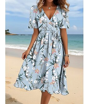 Damen Midikleid A Linie Kleid Urlaub Lässig Ferien Date Normale Passform Blumen Grafik Halbarm V Ausschnitt Blau Hellrosa Beige Sommer Frühling