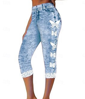 Damen Leggings Capri Pants Hohe Elastizität Urlaub Vintage Mode Wade-lange Mittlere Taille Blumen Grafik Druck Atmungsaktiv Weich Dehnbar Urlaub Casual Täglich Robin's Egg Blau Sommer Frühling