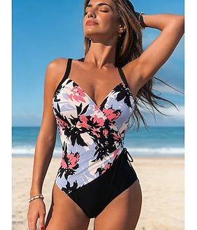 Damen Einteiler Badeanzug Slimming Rüschen Unterdraht Slips Urlaub Vintage Blumen Grafik V-Ausschnitt ärmellos Schwimmsuits