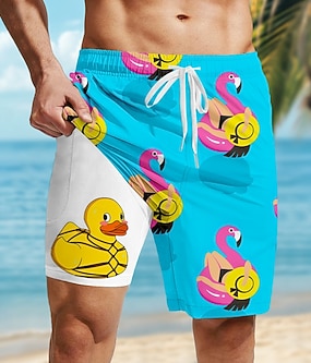 Herren Flamingo Lustig Ente Gefütterte Shorts 2 in 1 Badeshorts Badeshorts Mittlere Taille Hawaiianisch Urlaub Ferien Strandbekleidung Seitentaschen Mit Kompressionsfutter Elastischer Kordelzug in