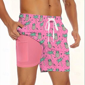Herren Ananas Kokospalme Gefütterte Shorts 2 in 1 Badeshorts Badeshorts Mittlere Taille Hawaiianisch Urlaub Ferien Strandbekleidung Seitentaschen Mit Kompressionsfutter Elastischer Kordelzug in der