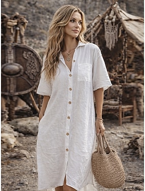 Damen Langes Kleid Maxikleid Kunstbaumwollleinen Hemdblusenkleid Freizeitkleid Elegant Täglich Date Lässiger Schnitt Einfarbig Halbarm Hemdkragen Blau Korallenrot Weiß Grün Sommer