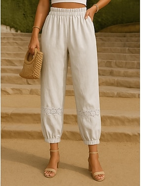 Damen Caprihose Kunstbaumwollleinen Hose Sommerhose Urlaub Basic Lässig Volle Länge Hohe Taille Blumen Bestickt Elastischer Bund Komfort Außenbereich Unelastisch Täglich Strand Lässig Grün Aprikose