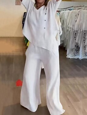 Damen Hemd Baumwoll-Leinen-Hemden Leinen-Set Set 2 teilig Einfarbig Mode Lässig Rundhals Täglich Straße Blau Weiß Khaki Grau Sommer Frühling Herbst Frühling & Herbst