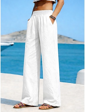 Damen Kunstbaumwollleinen Weites Bein Chinos Sommerhose Urlaub Basic Lässig Volle Länge Hohe Taille Einfach Tasche Elastischer Bund Bequem Komfort Weich Dehnbar Outdoor Straße Alltagskleidung
