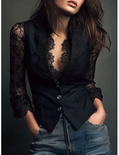 Damen Hemd Bluse Spitzentops Knöpfe Einfach Elegant Stilvoll Klassisch Langarm V Ausschnitt Normale Oberteile Täglich Ferien Ausgehen Schwarz Frühling Herbst