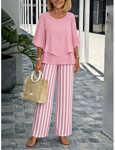 Damen Hosen-Sets Halbarm Schmetterling Rundhals Grafik Gestreift Elegant Urlaub Lässig Täglich Blau Gelb Rosa Frühling & Sommer Normale Passform