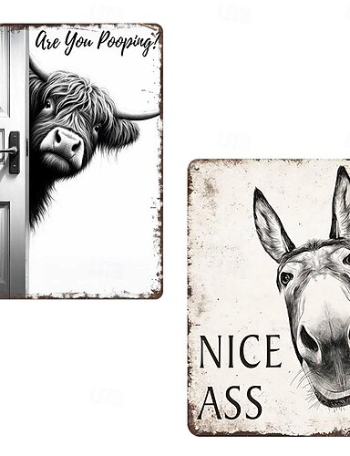 2er-Pack lustige Badezimmerschilder im Vintage-Stil, Hochland-Design: „Sind Sie gerade auf dem Klo?“, Esel „Schöner Hintern“, Wanddeko