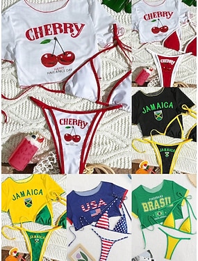 Damen Badeanzug Bikini Dreiteilig Tanga Bademode Schlank Rückenfrei Urlaub Strandbekleidung Buchstabe Rundhals Ärmellos Kurze Ärmel Badeanzüge