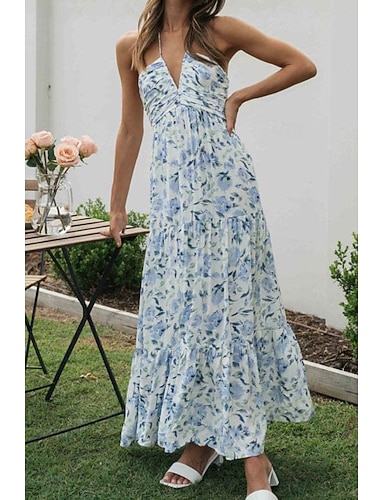 Damen Freizeitkleid Swingkleid Unterkleid Blumenblatt rückenfrei Print Träger langes Kleid Maxikleid hawaiianisch lässig Alltag Urlaub ärmellos Sommer