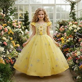 Blumenmädchenkleid Mädchen Formelle Kleidung Hochzeitskleidung Party Hochzeit Formell Niedlich Formell Patchwork Netz Blumen Kurzarm Rundhalsausschnitt Hellrosa Gelb Ab 4 Jahren