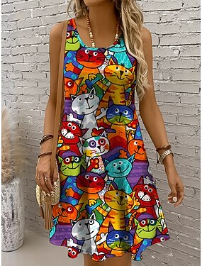 Damen Minikleid Sommerkleid A Linie Kleid Schulterfreies Kleid Urlaub Lässig Ferien Strand Normale Passform Grafik Katze Ärmellos Rundhalsausschnitt Gelb Rote Blau Purpur Sommer Frühling