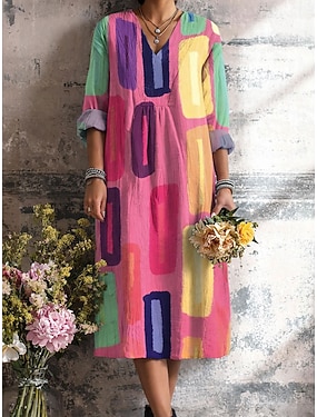 Damen Knielanges Kleid Sommerkleid A Linie Kleid Urlaub Lässig Boho Strand Party Lässiger Schnitt Grafik Geometrisch Abstrakt Langarm V Ausschnitt Rosa Purpur Grün Khaki Sommer Frühling