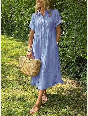 Damen Midikleid A Linie Kleid Urlaub Lässig Outdoor Ausgehen Lässiger Schnitt Gestreift Kurzarm Umlegekragen Blau Weiß Rote Purpur Sommer Frühling Herbst