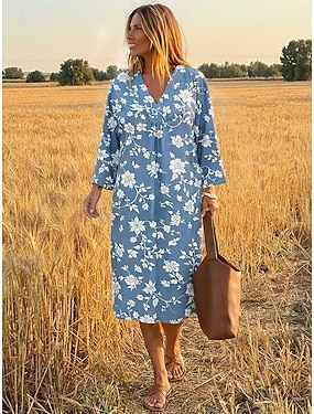 Damen Midi Kleid V-Ausschnitt Lange Ärmel Kaftan Leicht Lockerer Schnitt A-Linien Kleid Lässig Boho Party Ausgehen Floral Grafisch Lange Ärmel V-Ausschnitt Grau Grün Pink Lila Elfenbein
