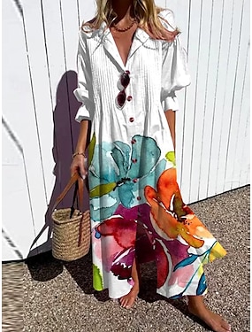 Damen-Hemdkleid, Freizeitkleid, Swing-Kleid, Maxi-Langkleid, Outdoor, Alltag, Date, Mode, modern, Hemdkragen, Knopfdruck, Kurzarm, Sommer, Frühling, lockere Passform, Blumenmuster