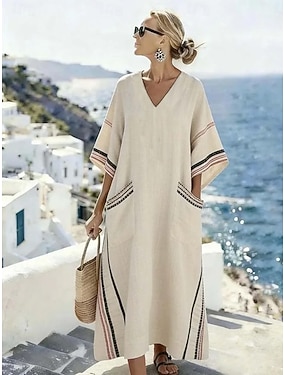 Damen Maxikleid Leinenartig Atmungsaktiv Leicht A-Linie Kleid Sommerkleid Lässig Täglich Lockere Passform Gestreift 3/4-Langarm V-Ausschnitt Blau Weiß Rot Beige Sommer Frühling Herbst