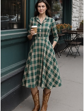 Damen Midikleid Figurbetontes Kleid Lässig Täglich Normale Passform Karomuster Dreiviertelarm Revers Grün Herbst Winter