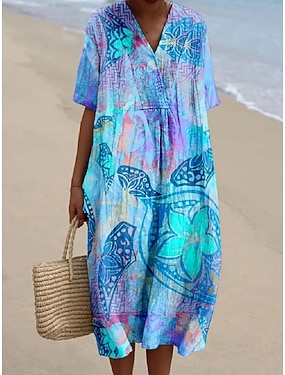 Damen Midikleid Sommerkleid Urlaub Lässig Strand Ausgehen Lässiger Schnitt Blumen Grafik Halbarm V Ausschnitt Blau Sommer