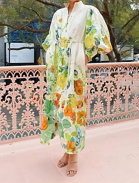 Damen Kleid-Set Freizeitkleid Druckkleid Mode Lässig Blumen Druck Langes Kleid Maxikleid Dreiviertelarm V Ausschnitt Täglich Outdoor Blau Rosa Himmelblau Sommer Frühling Normale Passform