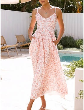 Damen Maxikleid A Linie Kleid Unterkleid Urlaub Lässig Outdoor Ausgehen Normale Passform Blumen Ärmellos V Ausschnitt Blau Gelb Rosa Rote Sommer Frühling
