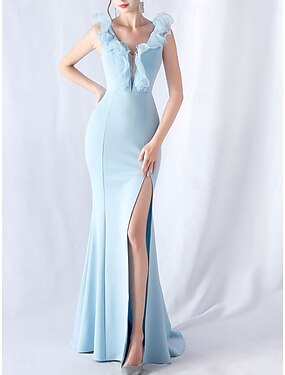 Mermaid Trompete Quinceanera Kleider Elegantes Kleid Hochzeit Hochzeitsgast Bodenkurze Ärmellos V-Ausschnitt Spandex mit Rüschen