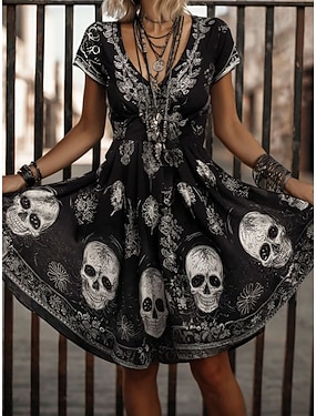 Frauen Totenkopf Druck Mini Kleid Lässiges Kleid T-Shirt Kleid Tee Kleid Sommerkleid A-Linie Kleid Urlaub Lässig Boho Strand Grafik Totenkopf Kurze Ärmel V-Ausschnitt Weiß Pink Blau Lila Frühling