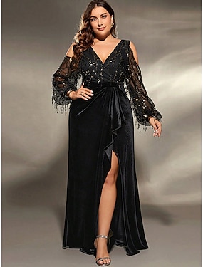 A-Line Abendkleid Elegantes Kleid Formelle Hochzeit Bodenlang Lange Ärmel V-Ausschnitt Pailletten mit Pailletten Schlitz