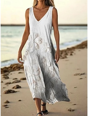 Damen Maxikleid Sommerkleid A Linie Kleid Unterkleid Urlaub Lässig Strand Ausgehen Normale Passform Blumen Grafik Ärmellos V Ausschnitt Weiß Sommer Frühling