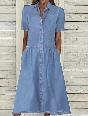 Damen Casual kleid Jeanshemd Kleid Maxikleid Denim Basic Modern Outdoor Täglich Urlaub Hemdkragen Taste Tasche Kurzarm Sommer Frühling Herbst 2023 Regular Fit Blau Einfarbig S M L XL XXL